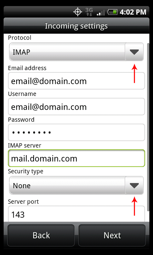 Protocol: We suggest that you utilize the IMAP protocol, as messages will not be downloaded to your device, but kept on the server. This method of reading your e-mail protects your messages from corruption and dataloss.