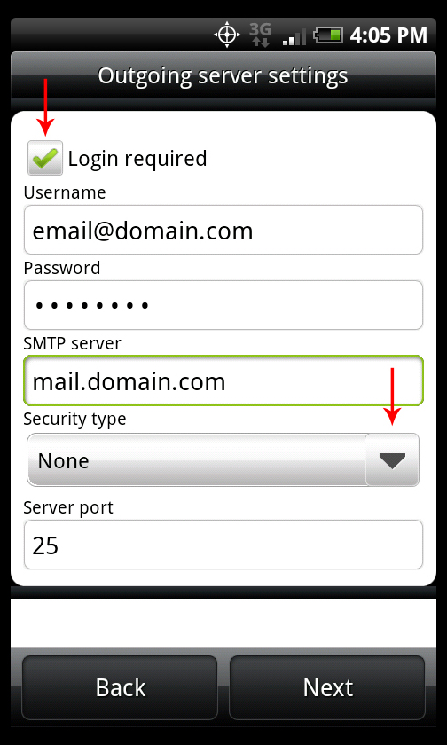 Username:As before in the Incoming Settings screen, the username of this account must match the e-mail address.