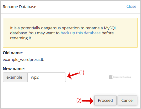 3. Under "Current Databases", You can see list of your all databases. Locate the Database and then click on "Rename" Icon.