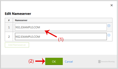 7. Enter your Nameserver in field 1 and field 2 and then click on the "OK" Button.
