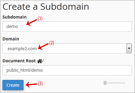 3. Under "Create a Subdomain" in the "Subdomain" field you should enter your subdomain name like "demo"(without quota) and should you have a number of domains, select the appropriate domain from the dropdown list.