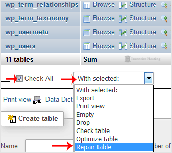 5. Scroll down and mark "Check All" then click on the Drop-down option and select "Repair table".