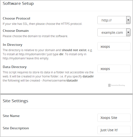 • In Directory: If you want to install this in a directory, for example example.com/directory, enter the directory name. Otherwise, leave this blank to install in your main domain example.com