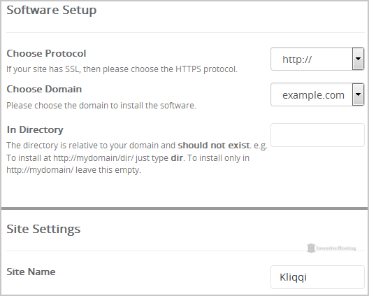 - In Directory: If you want to install this in a directory, for example example.com/directory, enter the directory name. Otherwise, leave this blank to install in your main domain example.com