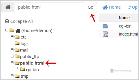 4. Navigate to the directory where you want to upload your files to. For example, should you wish to upload your file to the public html folder, you need to go to /public_html first. On the left side you can see a list of directories. Double Click on the "public_html" folder.