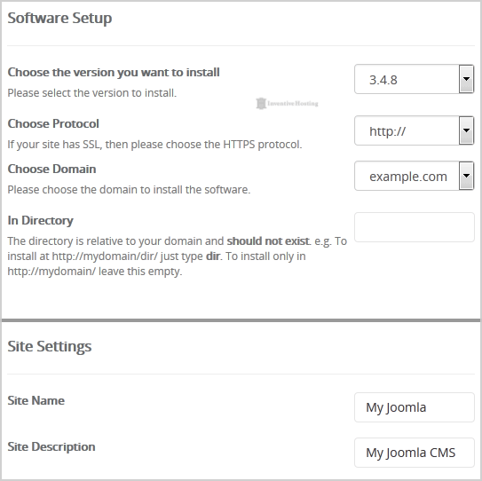 - In Directory: If you want to install this in a directory, for example example.com/directory, enter the directory name. Otherwise, leave this blank to install in your main domain example.com