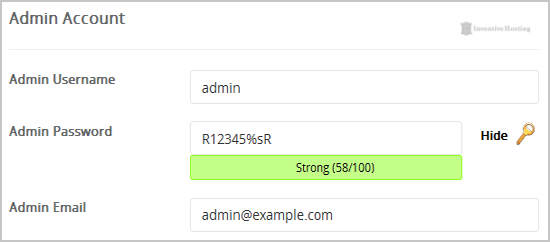 7. Under the "Admin Account" field enter the following information: