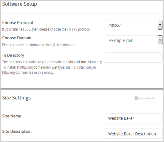 • In Directory: If you want to install this in a directory, for example example.com/directory, enter the directory name. Otherwise, leave this blank to install in your main domain example.com