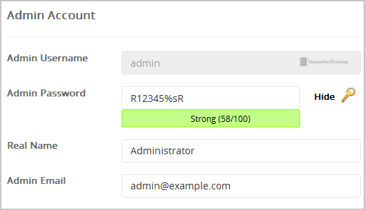 - Admin Username: The default username is "Admin" and the edit option is disabled.