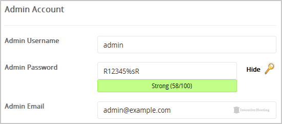 8. Under the "Admin Account" field enter the following information: