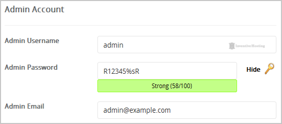 7. Under the "Admin Account" field enter the following information: