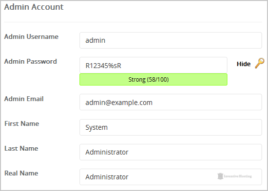 7. Under the "Admin Account" field enter the following information: