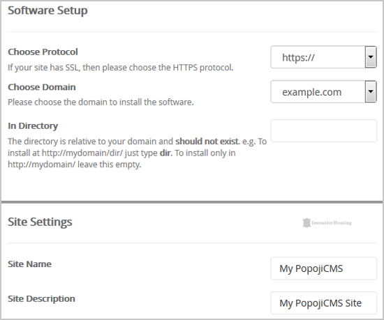 - In Directory: If you want to install this in a directory, for example example.com/directory, enter the directory name. Otherwise, leave this blank to install in your main domain example.com