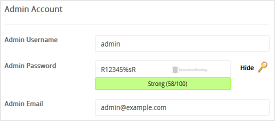 8. Under the "Admin Account" field enter the following information: